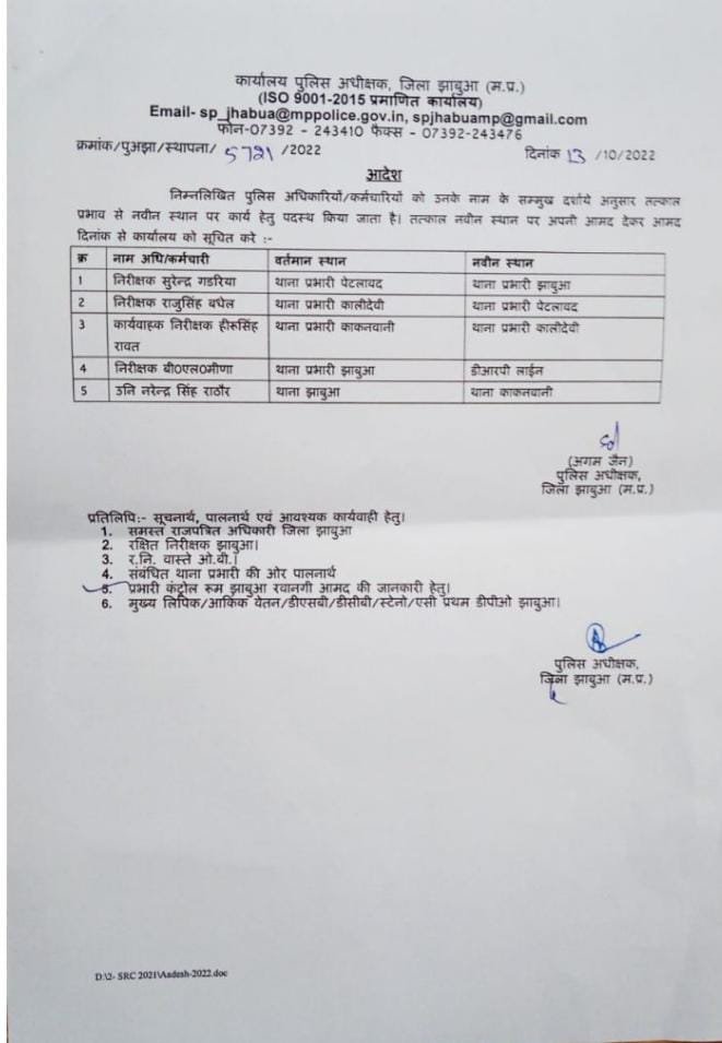 पुलिस अधीक्षक अगम जैन के निर्देश पर पुलिस अधिकारियों और कर्मचारियों के हुए तबादले देखिए सूची