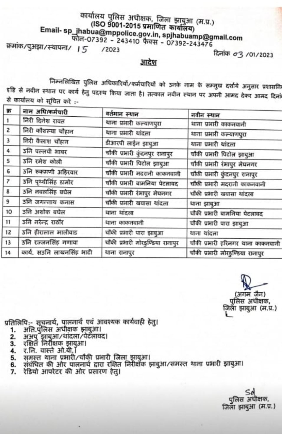 थांदला। पुलिस अधीक्षक अगम जैन के निर्देशानुसार वर्ष 2023 के प्रारंभिक दिनों में ही पुलिस प्रशासन में बड़े फेरबदल किए गए हैं। इनमें 14 पुलिस अधिकारी और कर्मचारियों को एक स्थान से दूसरे स्थान भेजा गया है।