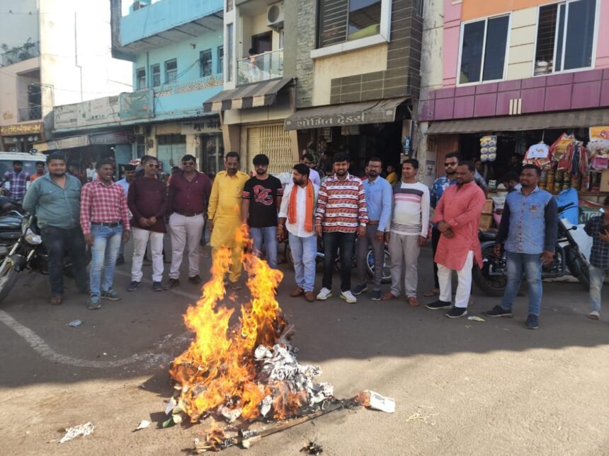थांदला। मध्य प्रदेश के पूर्व मुख्यमंत्री कमलनाथ द्वारा दिए गए विवादित बयान के बाद थांदला में भाजयुमो द्वारा नगर के मध्य आजाद चौक में कमलनाथ का पुतला दहन किया गया। पुतला दहन करने के पूर्व भाजयुमो के पदाधिकारी और कार्यकर्ताओं द्वारा जमकर नारेबाजी भी की गई।