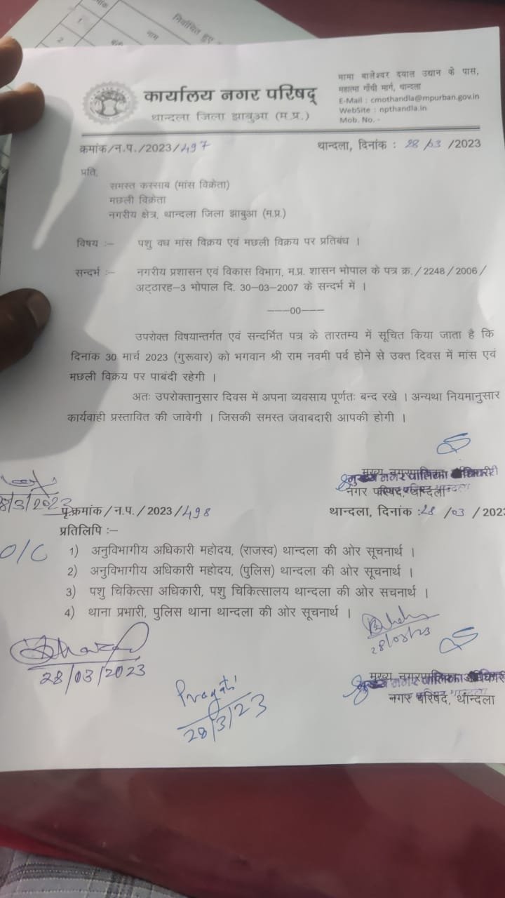 जानकारी देते हुए मुख्य नगरपालिका अधिकारी ने बताया कि नगरीय प्रशासन एवं विकास विभाग मध्यप्रदेश के पत्र के अनुसार रामनवमी पर्व (गुरुवार) को थांदला नगर में मांस और मछली का विक्रय पूर्ण तरह प्रतिबंधित रहेगा।