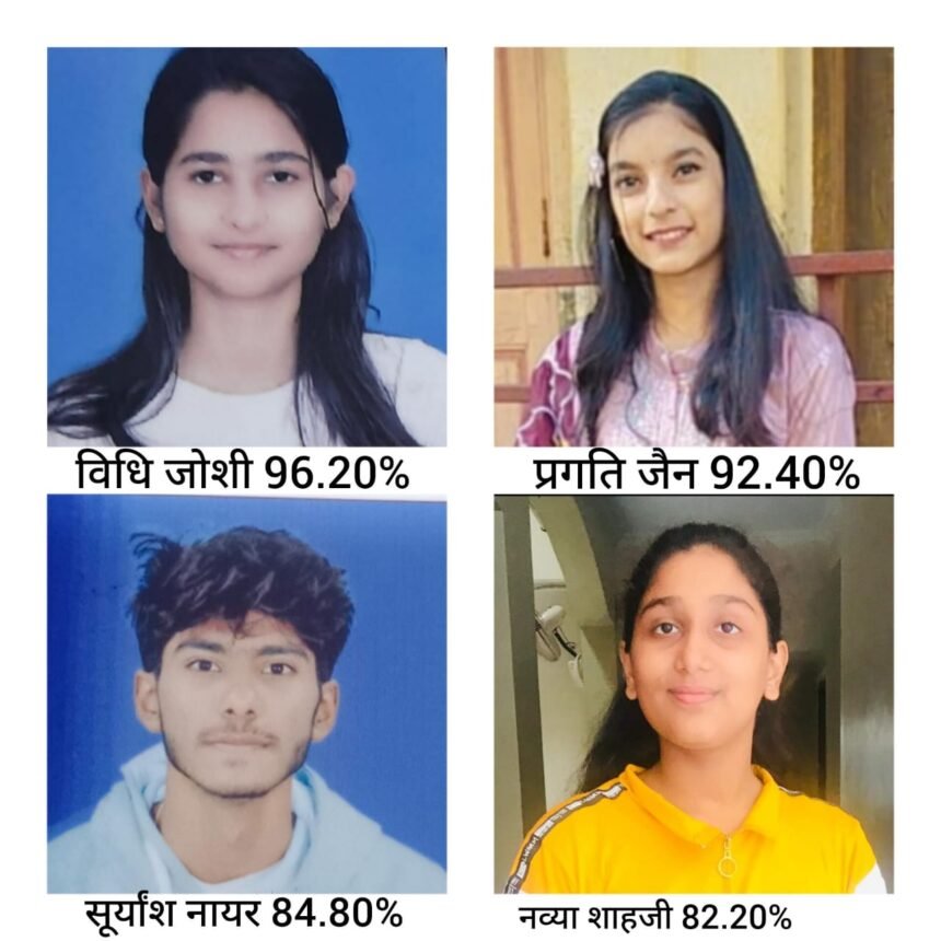 स्कूल की छात्रा विधि जोशी ने 96.20% बनाकर स्कूल, परिवार और नगर का नाम रोशन किया। उसी के साथ प्रगति जैन 92.40%, सूर्यांश नायर 84.80%, नव्या शाहजी 82.20%, अनिमेष राठौर 81%, ऐश्वर्य सोलंकी 80.80% , परिधि शर्मा 80.20% ने 80% से अधिक अंक प्राप्त कर अपना और स्कूल का नाम गोरवान्वित किया है।