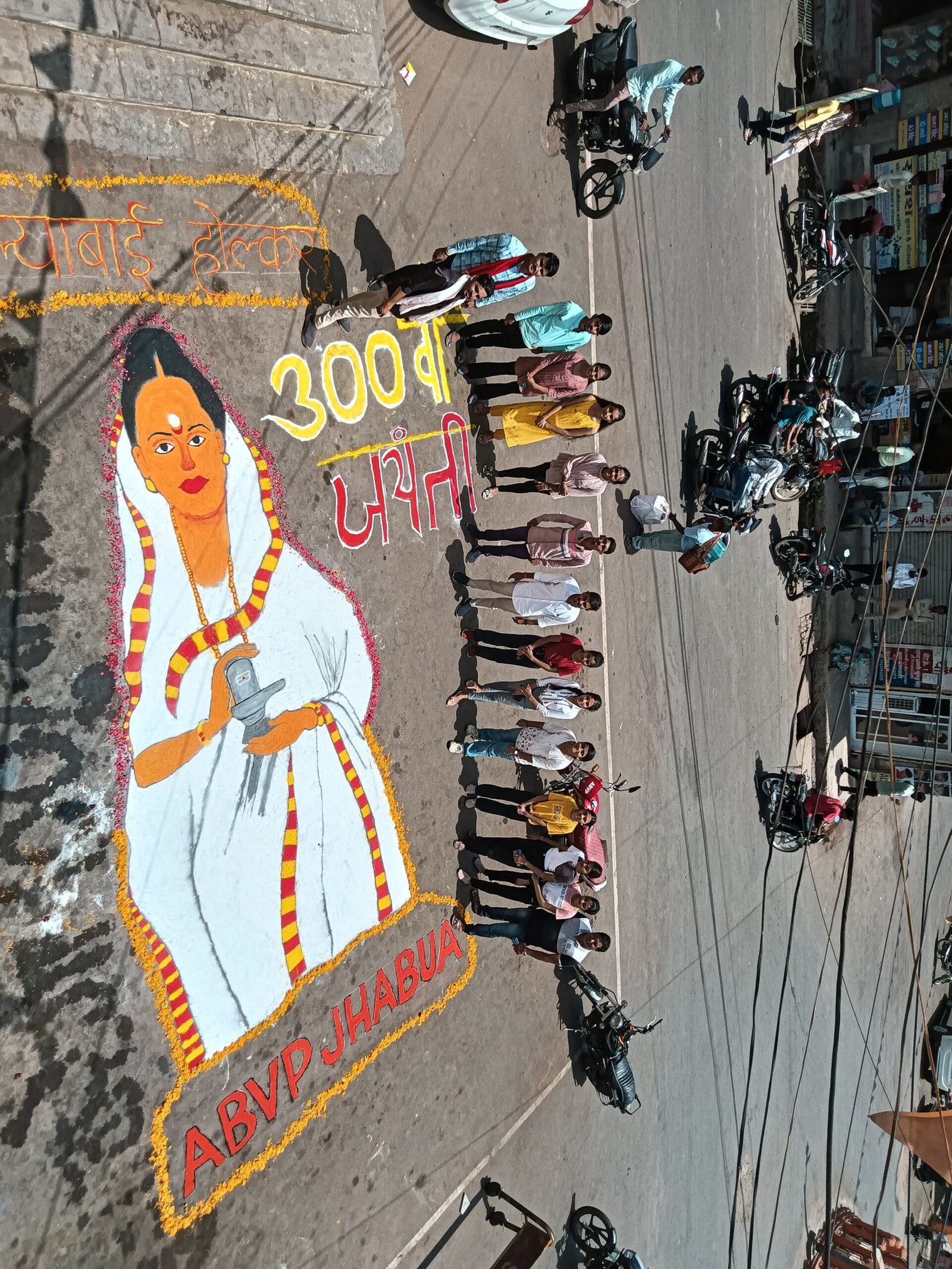 झाबुआ। अखिल भारतीय विद्यार्थी परिषद इकाई झाबुआ द्वारा शुक्रवार को लोकमाता देवी अहिल्याबाई होलकर की 300 वी जयंती के उपलक्ष्य में 15 फिट की रंगोली झाबुआ के राजवाड़ा क्षेत्र में बनाई गई।