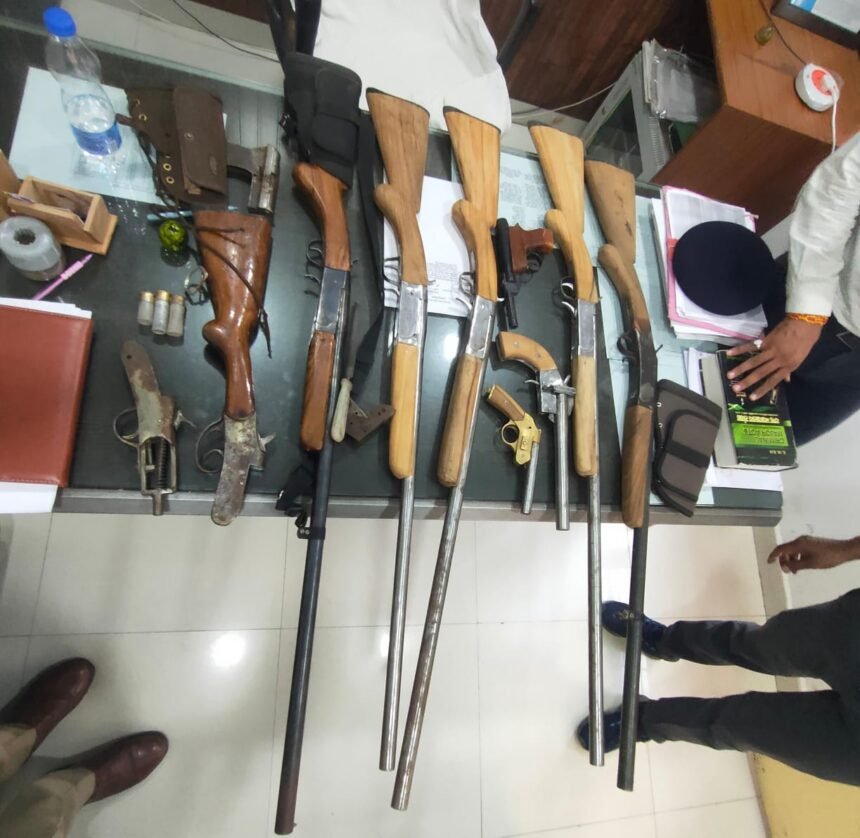 ताजा मामला झाबुआ की टीचर्स कॉलोनी का है। गुरुवार की शाम को झाबुआ पुलिस ने यहां पर आरोपी प्रकाश पिता रामचंद्र गलानी (उम्र 34) वर्ष के घर से 12 बोर की हाथ निर्मित 5 बंदूक, 315 बोर का हाथ निर्मित एक कट्टा, 12 बोर का हाथ निर्मित एक देसी कट्टा, एयर गन के कट्टे आदि जब तक किए हैं। कुल अवैध हथियारों की संख्या 8 बताई जा रही है। पुलिस ने विभिन्न धाराओं में आरोपी प्रकाश के खिलाफ प्रकरण दर्ज कर मामला विवेचना में लिया है।