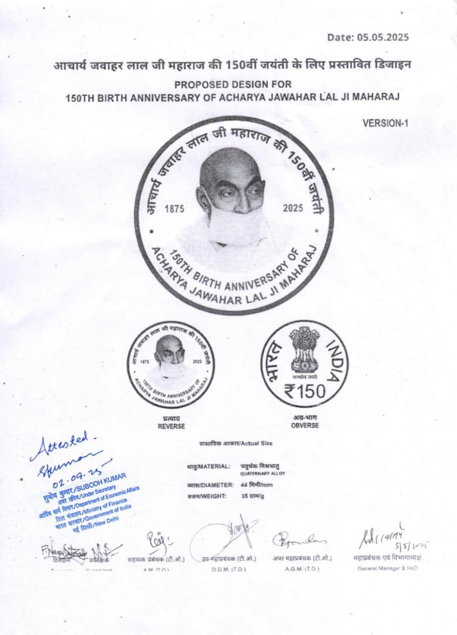 थांदला की माटी के गौरव, महान क्रांतिकारी स्वतंत्रता संग्राम सेनानी एवं युगदृष्टा जैन संत आचार्य 1008 श्री जवाहरलाल जी महाराज साहब के जन्म के 150 वर्ष पूर्ण होने के उपलक्ष्य में भारत सरकार द्वारा डाक टिकट एवं ₹150 मूल्य का स्मारक सिक्का जारी करने संबंधी अधिसूचना दिनांक 01 सितम्बर 2025 को प्रकाशित कर दी गई है।
